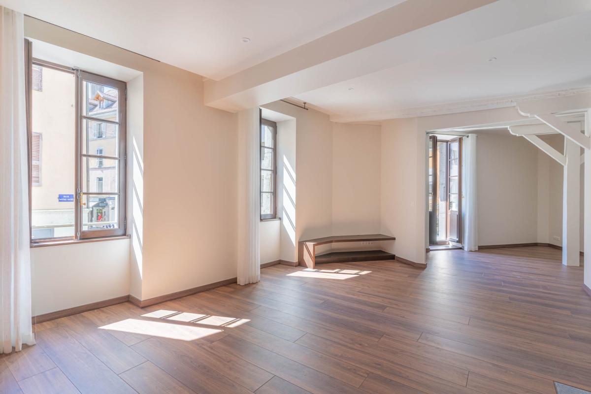 A LOUER, grand 3P+C de 111 m² en 1er étage à ANNECY situé en plein centre ville dans un immeuble bourgeois. Il bénéficie d'une rénovation de qualité, d'un balcon ainsi qu'une coursive donnant accès au logement avec un local de stockage.