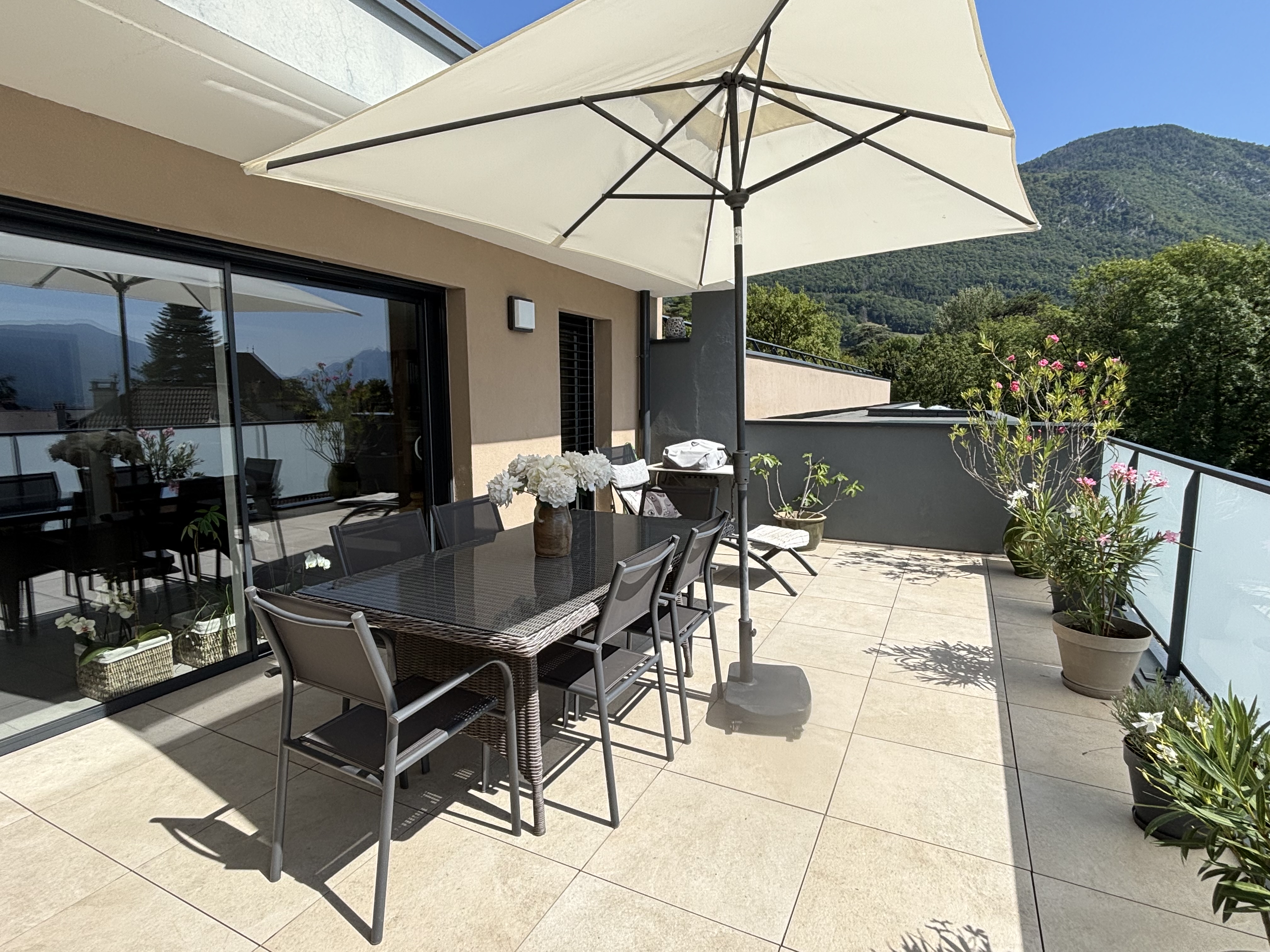 ANNECY LE VIEUX - Au DERNIER ETAGE d'un ensemble immobilier de standing construit en 2021, superbe appartement contemporain de 96 m² traversant avec 2 sur 2 grandes terrasses. Appartement proposant une cuisine équipée ouverte sur un espace de vie avec salle à manger et salon le tout ouvrant par de grandes baies vitrées sur la terrasse. Espace nuit avec deux chambres dont une suite parentale avec salle de douche attenante, une seconde chambre sur balcon côté montagnes, une salle de bains et une buanderie. Prestations de très belle qualité. Cave, parking privé sécurisé et double garage + 50.000 € . Ch/an: 2.304 € Lots: 23