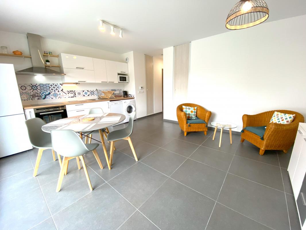 Ce TYPE 2 meublé de 43m² de situe au 2ème étage d'une résidence récente (2022) entre ville et lac.