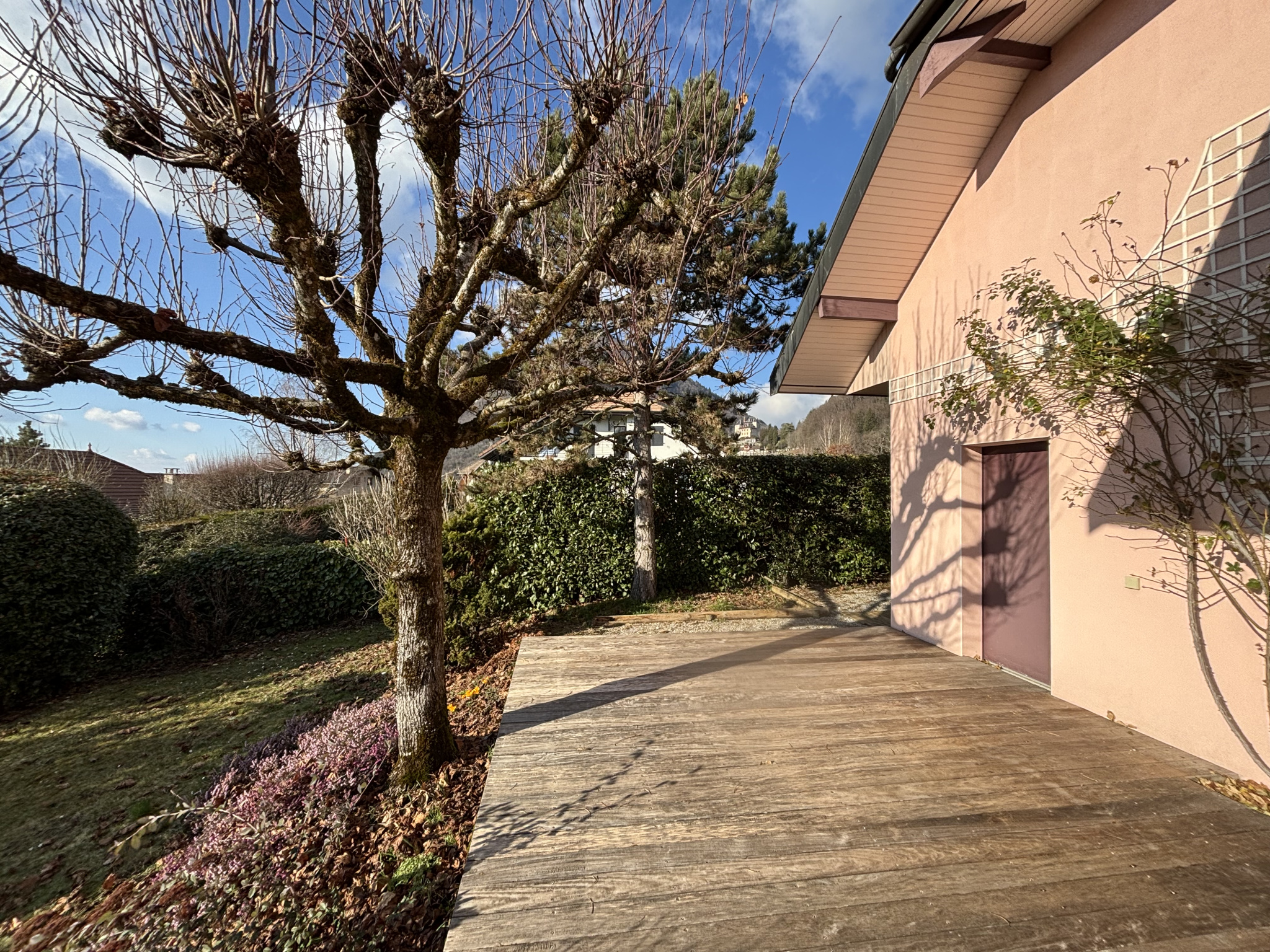 A quelques pas du village de MENTHON au calme avec un beau panorama nature, lac et Chateau, spacieuse et lumineuse villa d'architecte implantée sur 1219 m2 de terrain arboré et cloturé. Maison proposant un vaste espace de vie avec cheminée et cuisine aménagée le tout de plain-pied sur le jardin, au RDC une chambre avec salle d'eau et wc et à l'étage 3 chambres dont une suite parentale avec terrasse vue sur le lac et un grenier aménageable avec possibilité d'agrandissement. En annexes un double garage et un sous-sol partiel avec une buanderie. Grande cour goudronnée et portail électrique.